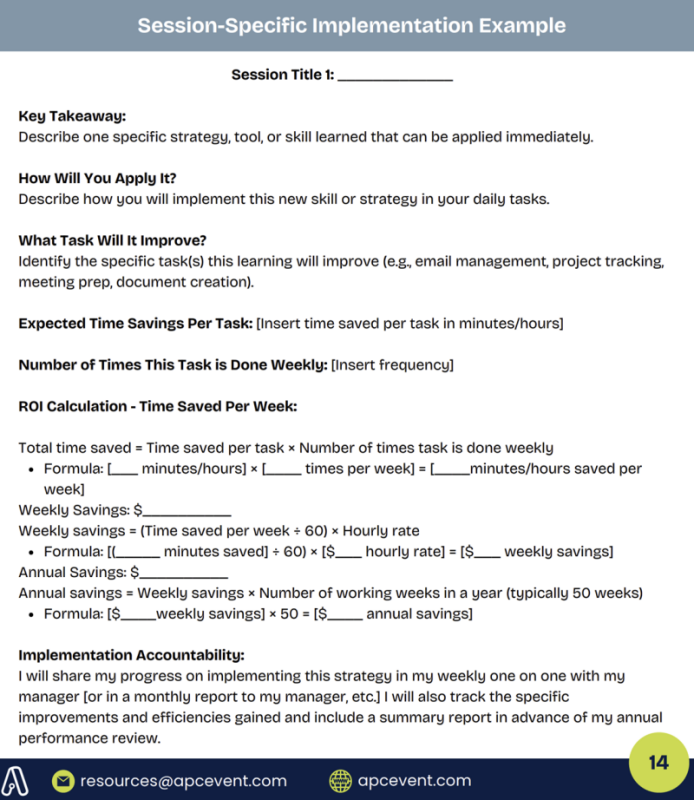 After you draft your session-specific implementation plans, then you can summarize the ROI from each session on a cover memo to make presenting the information to your executive more efficient. If applicable, you can expand on this summary by highlighting how you’ll share the things you’ve learned with other team members which increases the benefit to the company.